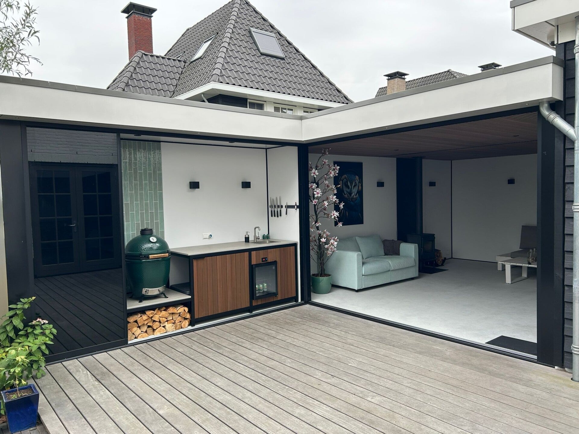 Ter afwerking is de buitenkeuken geschoopeerd en gepoedercoat in het zwart (RAL9005).